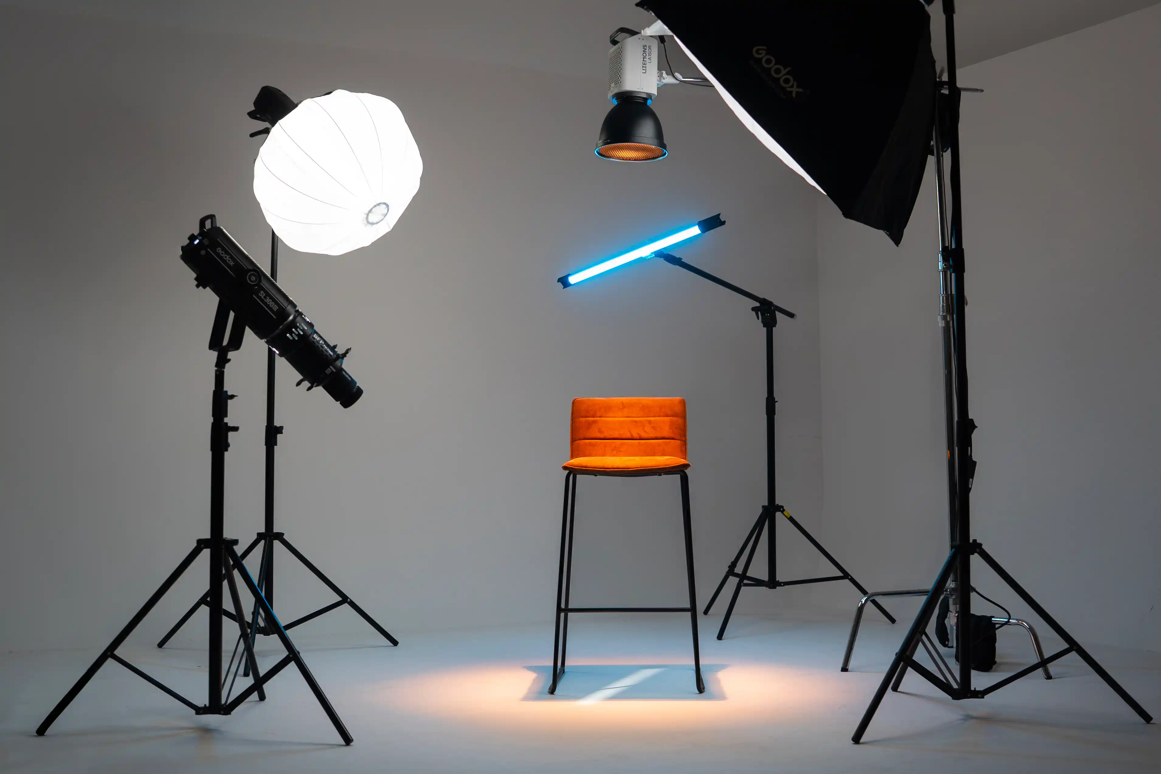 استوديو مجهز بأحدث الميكروفونات، الكاميرات، وأنظمة الصوت والإضاءة